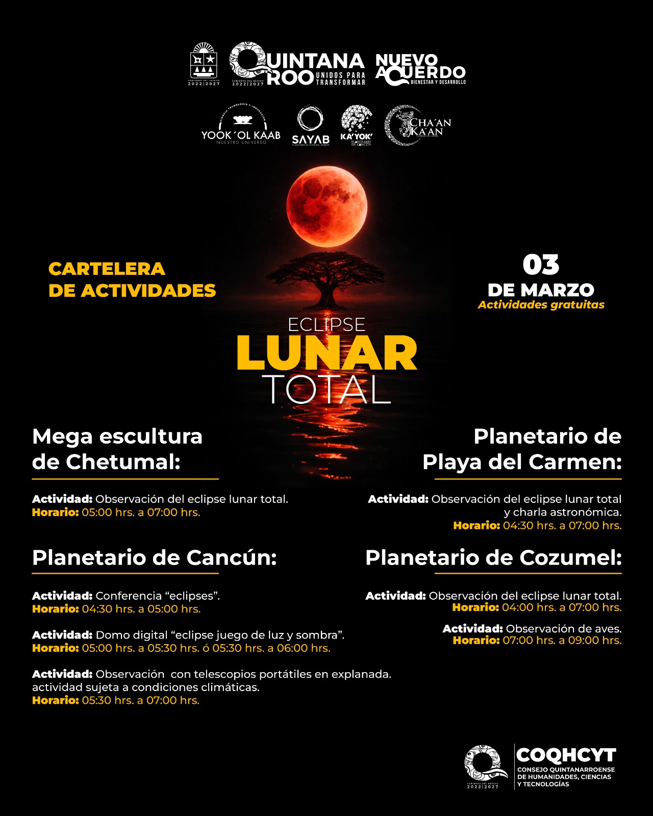 Chetumal.- El Consejo Quintanarroense de Humanidades, Ciencias y Tecnologías (COQHCYT), a través de la Red de Planetarios del Estado, invita al público en general a participar en las actividades de divulgación científica organizadas con motivo del eclipse lunar total, las cuales incluirán la observación del fenómeno astronómico mediante telescopios, así como conferencias, proyecciones audiovisuales en domo, observación de aves y diversas dinámicas educativas.