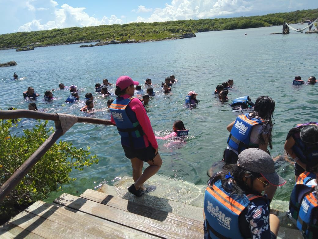 En total, 57 niñas y niños, acompañados por cuatro docentes, participaron en un recorrido guiado por especialistas del parque, donde conocieron el significado de Xel-Há —que en lengua maya significa “orilla del agua”—, así como la importancia ecológica de la caleta natural, los manglares y la piedra caliza característica del suelo quintanarroense.